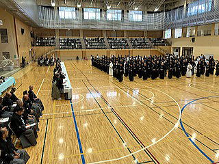 | 4会場に分かれて居合の試合(トーナメント戦)を実施しました。 居合の試合は、2名の出場者が、真剣または模擬刀を用い、あらかじめ定められた全日本剣道連盟居合と各流派の形、 合わせて5本を6分以内に演武し、その「修業の深さ」、「礼儀」、「技の正確さ」、「心構え」などを審判員が判定して勝敗を決します |