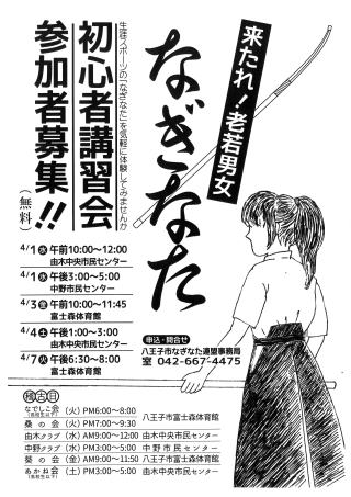 申)9/17(水)までに電話で八王子市なぎなた連盟へ 問)室 信子 (〒193-0833 めじろ台2-63-16) TEL:667-4475 |