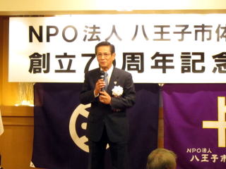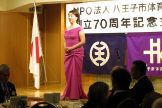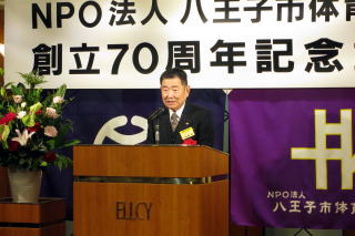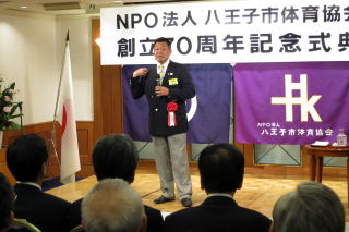 NPO法人八王子市体育協会は、今年創立70周年を迎え、平成28年11月6日午後3時より第一部:記念式典、第二部:記念講演、第三部:祝宴を八王子エルシィで実施した。 記念講演は「リオから東京へ 〜スポーツの力を信じて〜」と題して、ロサンゼルスオリンピックで銅、アテネオリンピックで銀メダルを獲得され「中年の星」と呼ばれた現(公財)東京都体育協会会長兼日本体育大学社会体育学科教授で医学博士の山本博氏の記念講演が行われた。山本会長よりは、「最後の最後まで諦めるな」というお話を頂き、祝賀会では八王子在住のソプラノ歌手、田中美佐代様をはじめ、八王子在住のコーラスグループ、ピアノ、フルートの各奏者の演奏で会も盛り上がった。 当日の式典の出席者は、衆議院議員、都・市議会の各議員、市長、市役所の方々、八体協所属団体の人達の合計198名だった。 この70周年の記念行事をバネに、更なる八体協の発展を祈念しながら盛会裡に式典、祝宴は終了した。 |